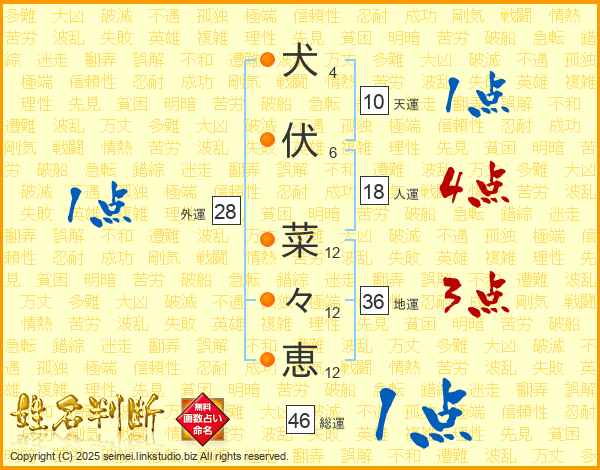 犬(4画)伏(6画) 菜(12画)々(12画)恵(12画)
