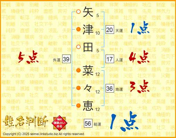 矢(5画)津(10画)田(5画) 菜(12画)々(12画)恵(12画)