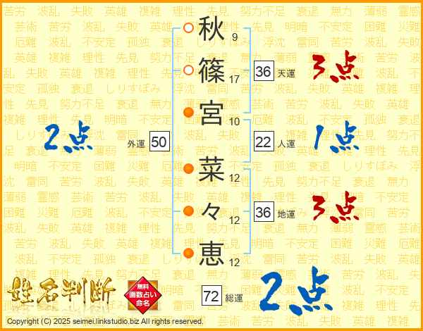 秋(9画)篠(17画)宮(10画)  菜(12画)々(12画)恵(12画)