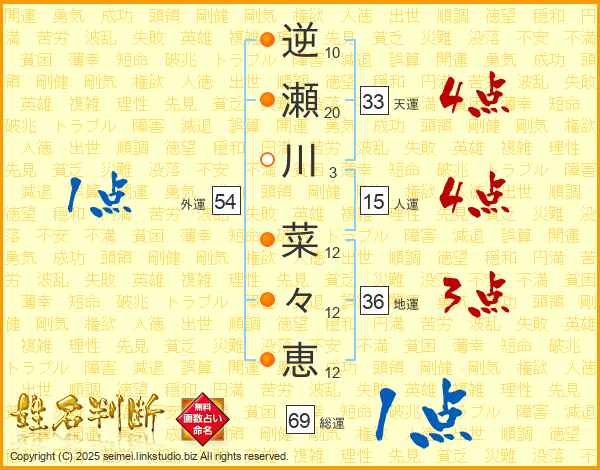 逆(10画)瀬(20画)川(3画) 菜(12画)々(12画)恵(12画)