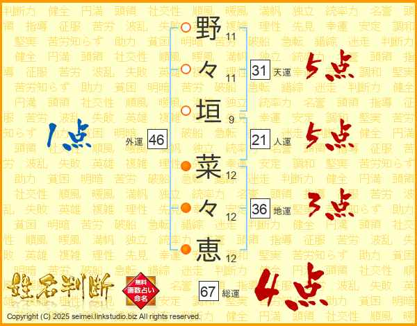 野(11画)々(11画)垣(9画) 菜(12画)々(12画)恵(12画)