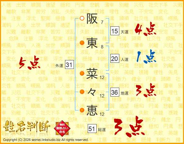 阪(7画)東(8画) 菜(12画)々(12画)恵(12画)