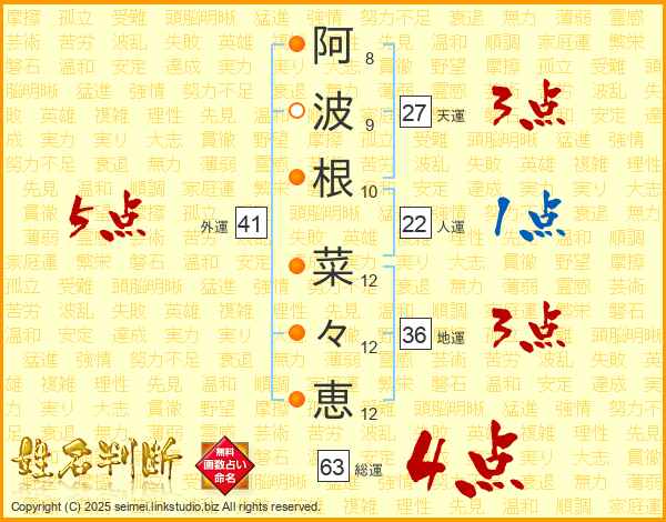 阿(8画)波(9画)根(10画) 菜(12画)々(12画)恵(12画)