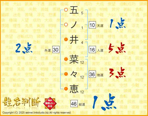 五(5画)ノ(1画)井(4画) 菜(12画)々(12画)恵(12画)