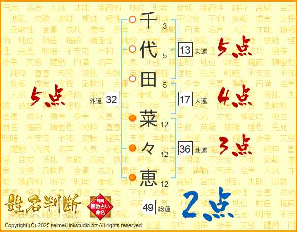千代田菜々恵さんの総運は49画の2点!