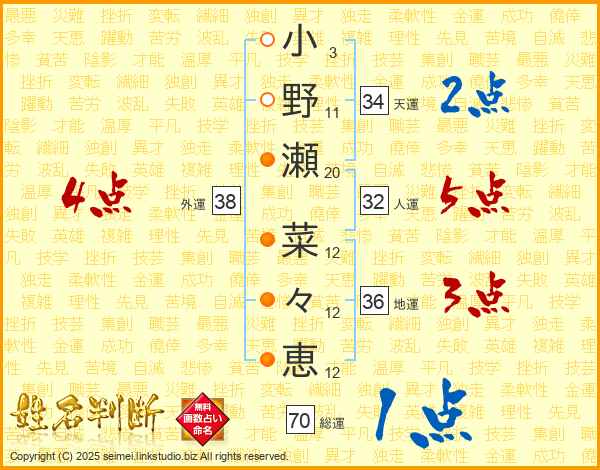 小(3画)野(11画)瀬(20画) 菜(12画)々(12画)恵(12画)