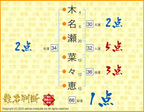 木(4画)名(6画)瀬(20画) 菜(12画)々(12画)恵(12画)