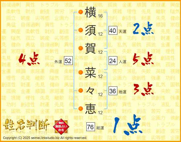 横(16画)須(12画)賀(12画) 菜(12画)々(12画)恵(12画)