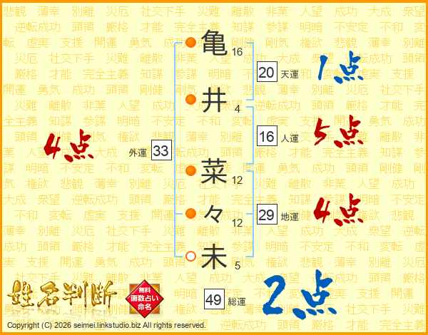 亀(16画)井(4画) 菜(12画)々(12画)未(5画)