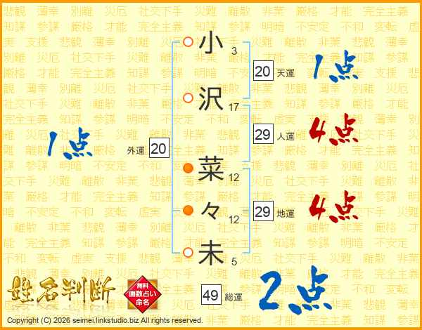 小(3画)沢(17画) 菜(12画)々(12画)未(5画)