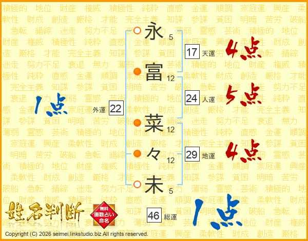 永(5画)富(12画) 菜(12画)々(12画)未(5画)