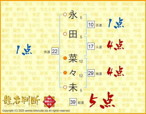 永(5画)田(5画) 菜(12画)々(12画)未(5画)