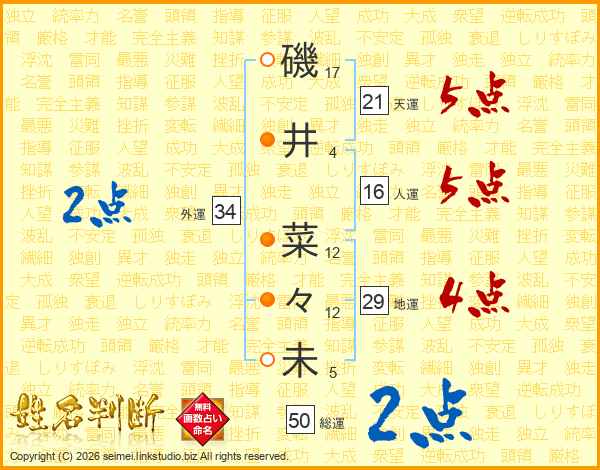 磯(17画)井(4画) 菜(12画)々(12画)未(5画)