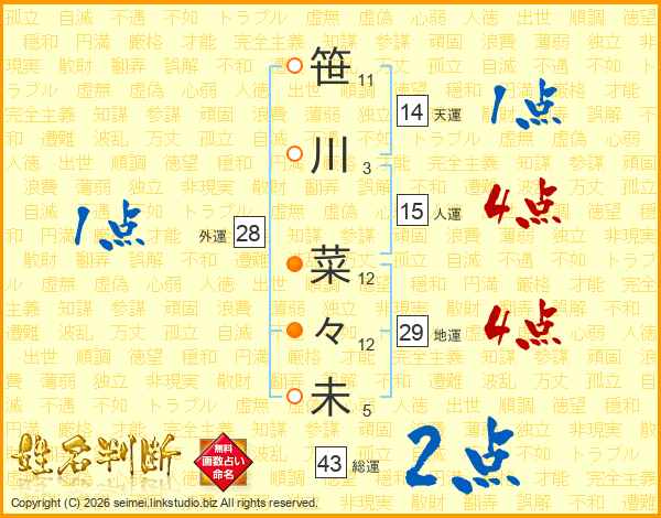 笹(11画)川(3画) 菜(12画)々(12画)未(5画)