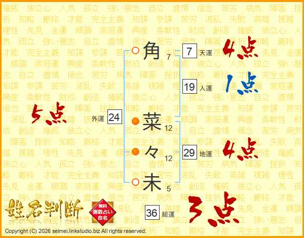 生活面を象徴する運勢です。外部から受ける影響力を表し、結婚運、家庭運や職場、環境への順応性を表します。総運から人運を引いた画数。姓や名が1文字の場合を除く。