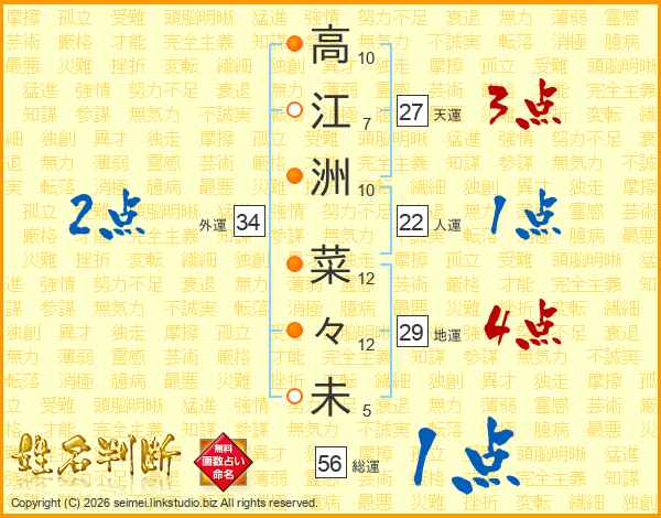 高(10画)江(7画)洲(10画) 菜(12画)々(12画)未(5画)