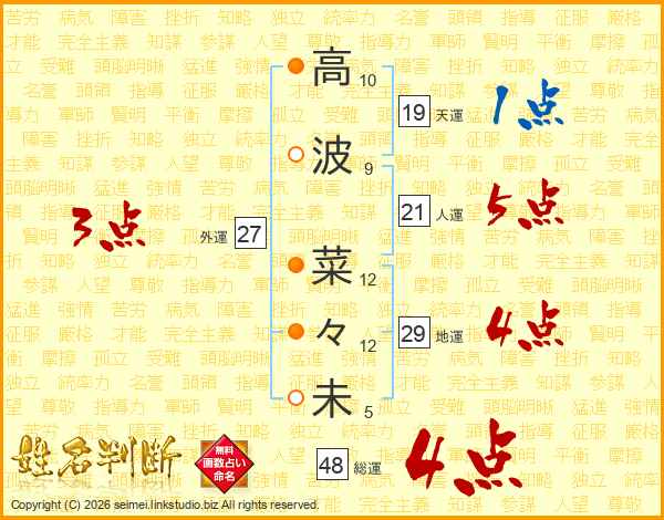 高(10画)波(9画) 菜(12画)々(12画)未(5画)