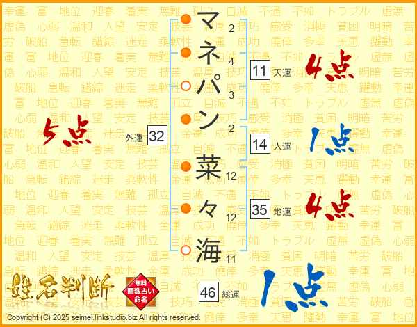 生活面を象徴する運勢です。外部から受ける影響力を表し、結婚運、家庭運や職場、環境への順応性を表します。総運から人運を引いた画数。姓や名が1文字の場合を除く。