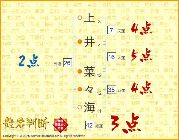 上(3画)井(4画) 菜(12画)々(12画)海(11画)