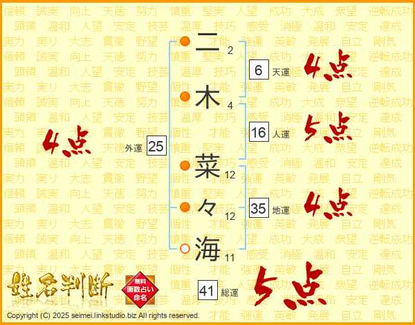 二(2画)木(4画) 菜(12画)々(12画)海(11画)