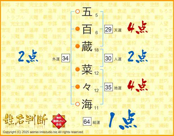 生活面を象徴する運勢です。外部から受ける影響力を表し、結婚運、家庭運や職場、環境への順応性を表します。総運から人運を引いた画数。姓や名が1文字の場合を除く。