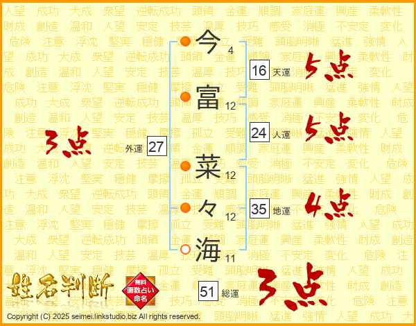 今(4画)富(12画) 菜(12画)々(12画)海(11画)