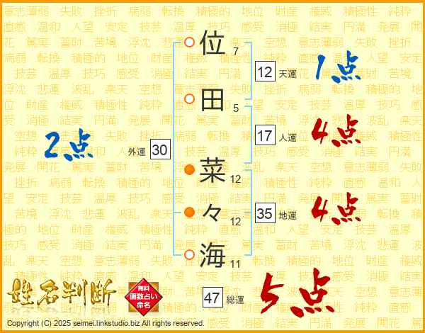 位(7画)田(5画) 菜(12画)々(12画)海(11画)