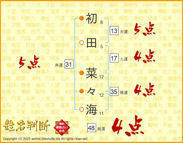 初(8画)田(5画) 菜(12画)々(12画)海(11画)