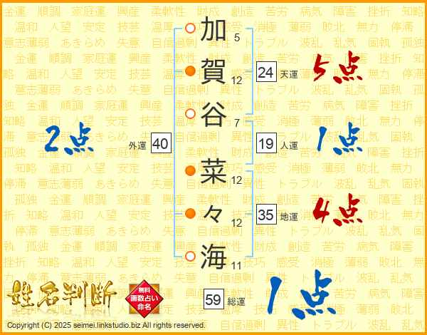 加(5画)賀(12画)谷(7画) 菜(12画)々(12画)海(11画)