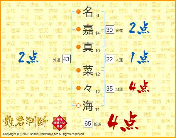 名(6画)嘉(14画)真(10画) 菜(12画)々(12画)海(11画)