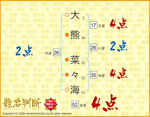 大(3画)熊(14画) 菜(12画)々(12画)海(11画)