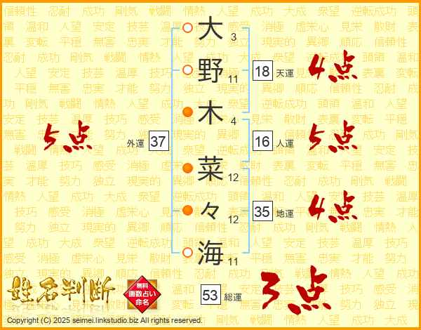 大(3画)野(11画)木(4画) 菜(12画)々(12画)海(11画)