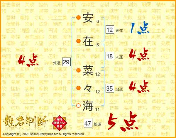 安(6画)在(6画) 菜(12画)々(12画)海(11画)