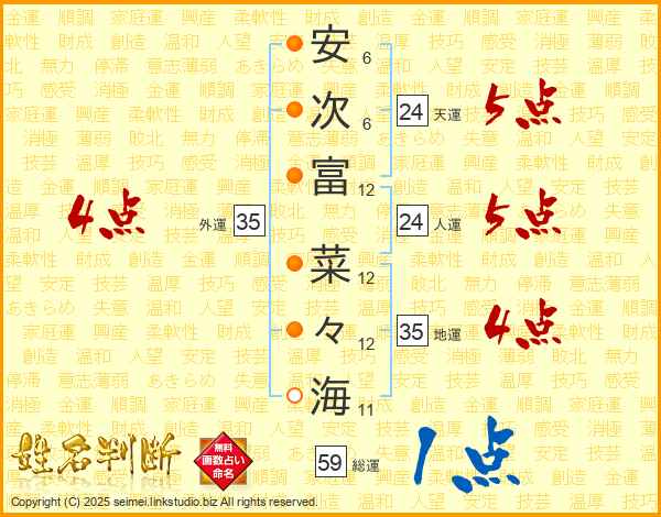 安(6画)次(6画)富(12画) 菜(12画)々(12画)海(11画)