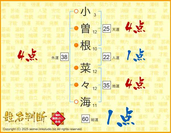 小(3画)曽(12画)根(10画) 菜(12画)々(12画)海(11画)