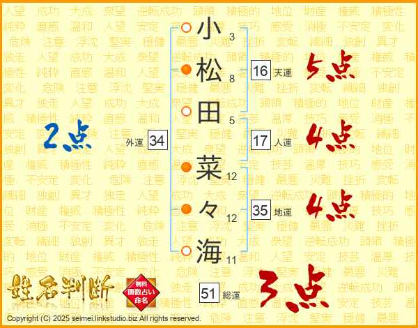 小(3画)松(8画)田(5画) 菜(12画)々(12画)海(11画)