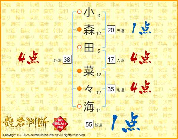 小(3画)森(12画)田(5画) 菜(12画)々(12画)海(11画)