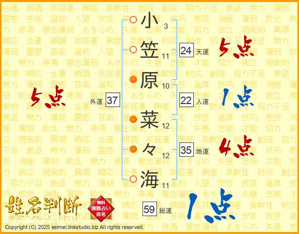 小(3画)笠(11画)原(10画) 菜(12画)々(12画)海(11画)