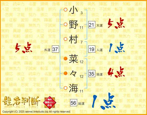 小(3画)野(11画)村(7画) 菜(12画)々(12画)海(11画)