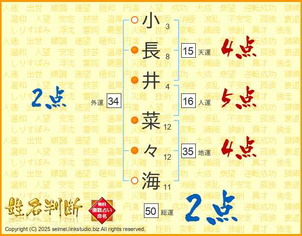 小(3画)長(8画)井(4画) 菜(12画)々(12画)海(11画)