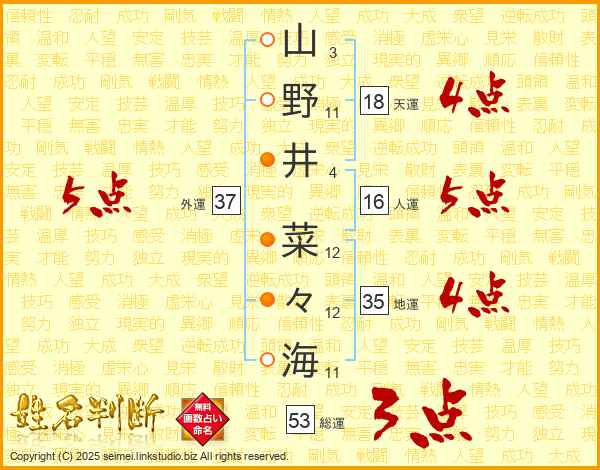 山(3画)野(11画)井(4画) 菜(12画)々(12画)海(11画)