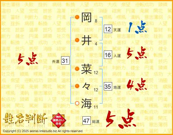 岡(8画)井(4画) 菜(12画)々(12画)海(11画)