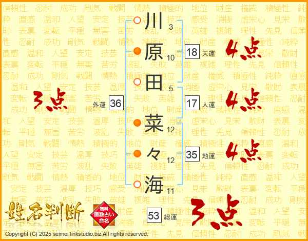 川(3画)原(10画)田(5画) 菜(12画)々(12画)海(11画)