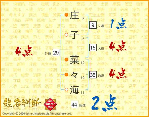庄(6画)子(3画) 菜(12画)々(12画)海(11画)