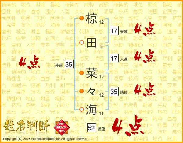 椋田菜々海さんの総運は52画の4点!