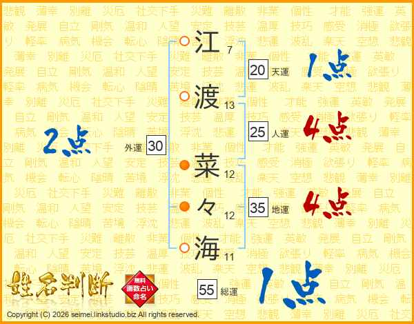 江(7画)渡(13画) 菜(12画)々(12画)海(11画)