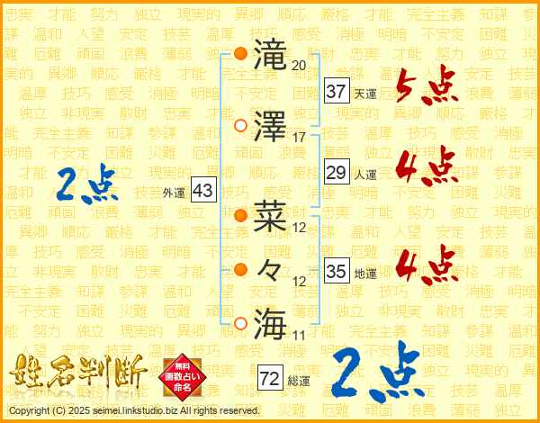滝(20画)澤(17画) 菜(12画)々(12画)海(11画)