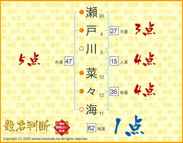 瀬(20画)戸(4画)川(3画) 菜(12画)々(12画)海(11画)