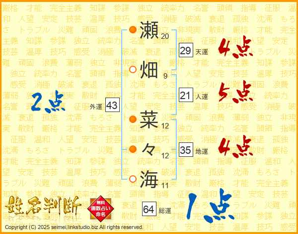 瀬(20画)畑(9画) 菜(12画)々(12画)海(11画)