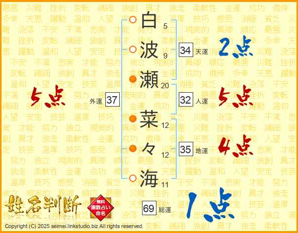 白(5画)波(9画)瀬(20画) 菜(12画)々(12画)海(11画)